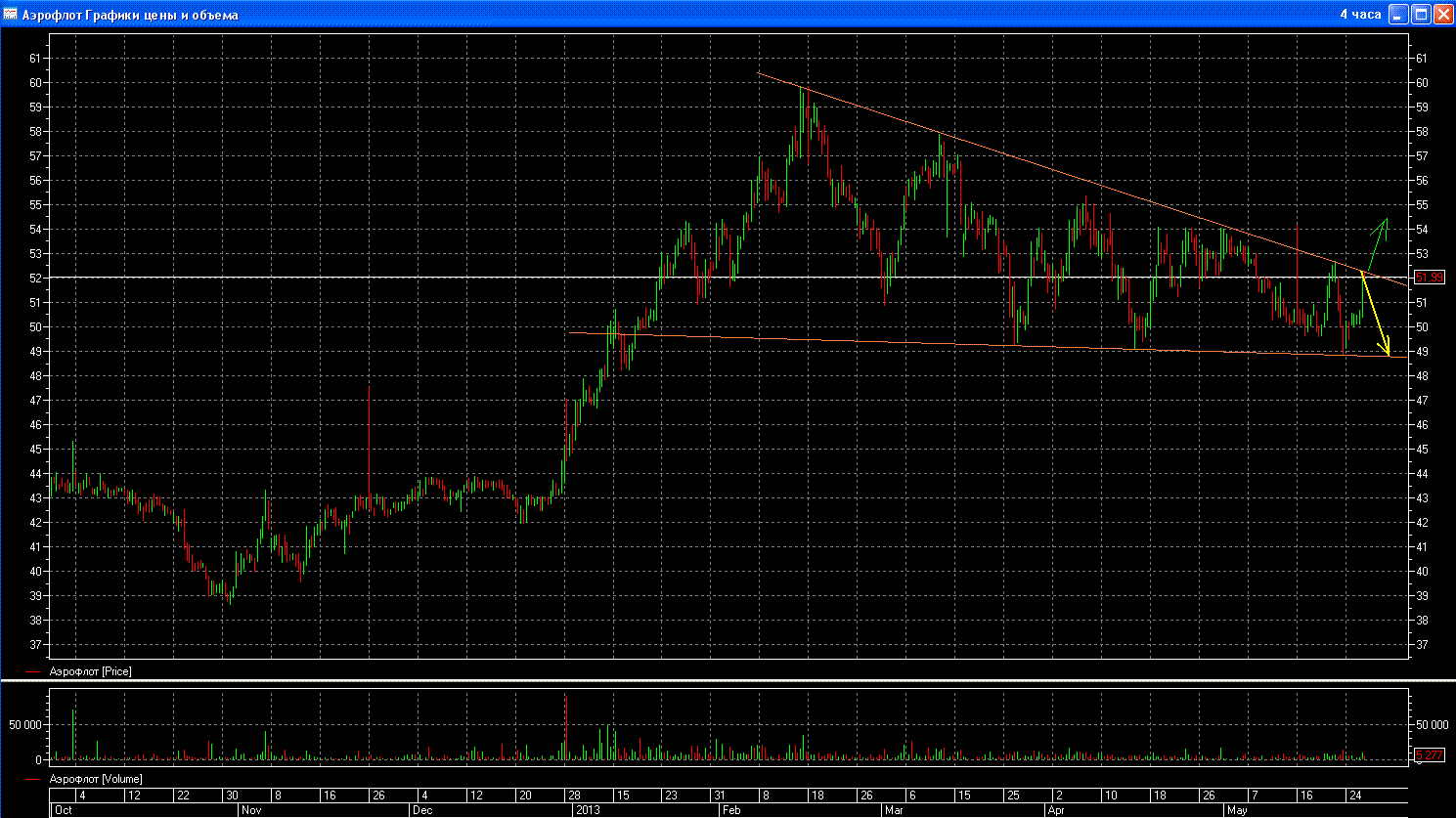 Как вы видите долгое время - с начала года идет консолидация в треугольнике..Сейчас цена на верхнем сопротивлении, вероятно не пройдет, но надо смотреть.. Если не пройдет то пойдет вниз на 48,8, если выйдет- перспективы хорошие