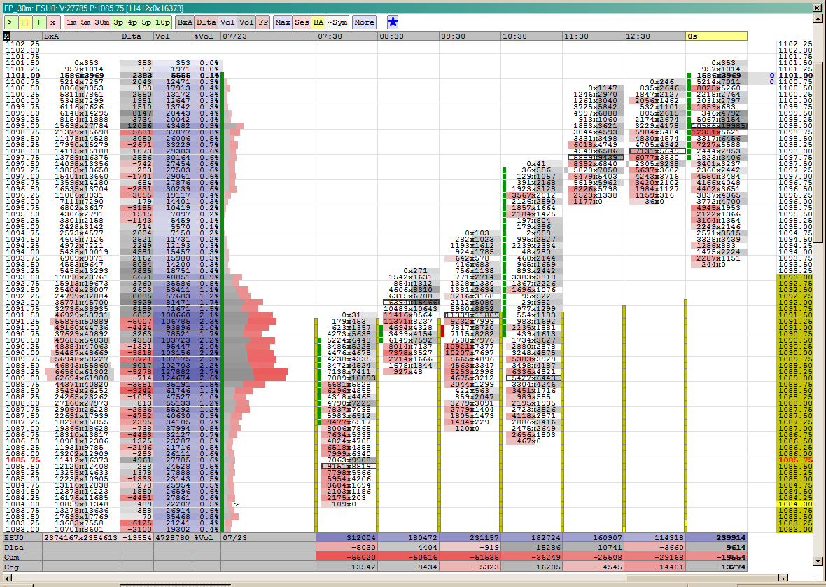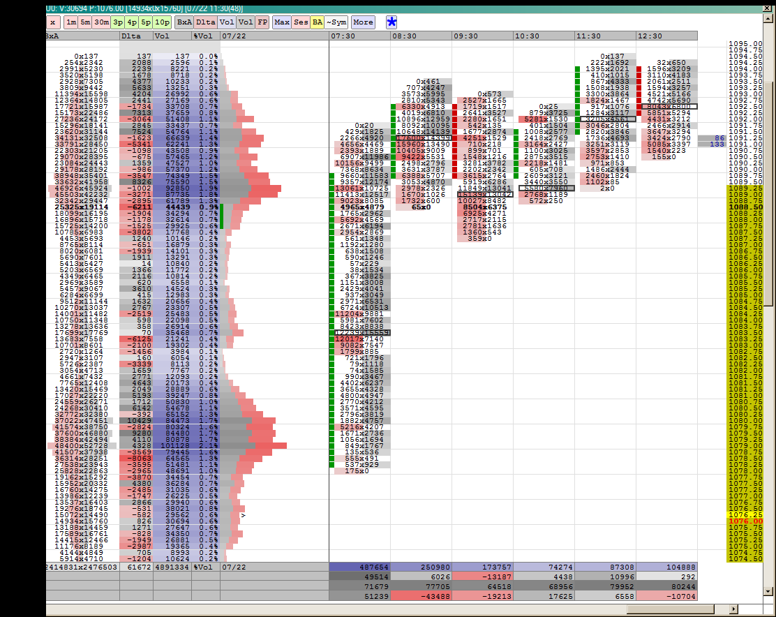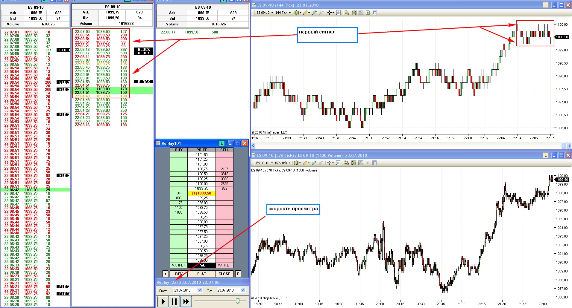 Валерий ,видно что вы начинаете потехоньку разбиратса в ленте(здесь торопитса ненадо).Первый ваш сигнал был 1099.50,что значит ето ....ето цена ,которая интересует очень многих,посмотрите какой блок ,где он призошёл????,лента от 10>динамика почти не снижаетса,конечно же протестируют 1100.00(не знаю ето риальный тайм записаи? или нет?)Ну большие принты дали цену...конечно в таких ситуасиях надо входить по маркет ордер,потомучто не за филит.......Один момент,когда вы ловите верхи или низы,стоп луз нужно ставить немного больше 1-1.5 поинта,потому что идеш за большой рыбой,или выжди немного,что бы не рисковать сильно,но в етом случае можеш пропустить хороший сет ап.......Всем привет, показалось интересным как вчера пытались пробить текущий хай сессии, после консолидации у 1100, наторговали более 3000 контрактов,