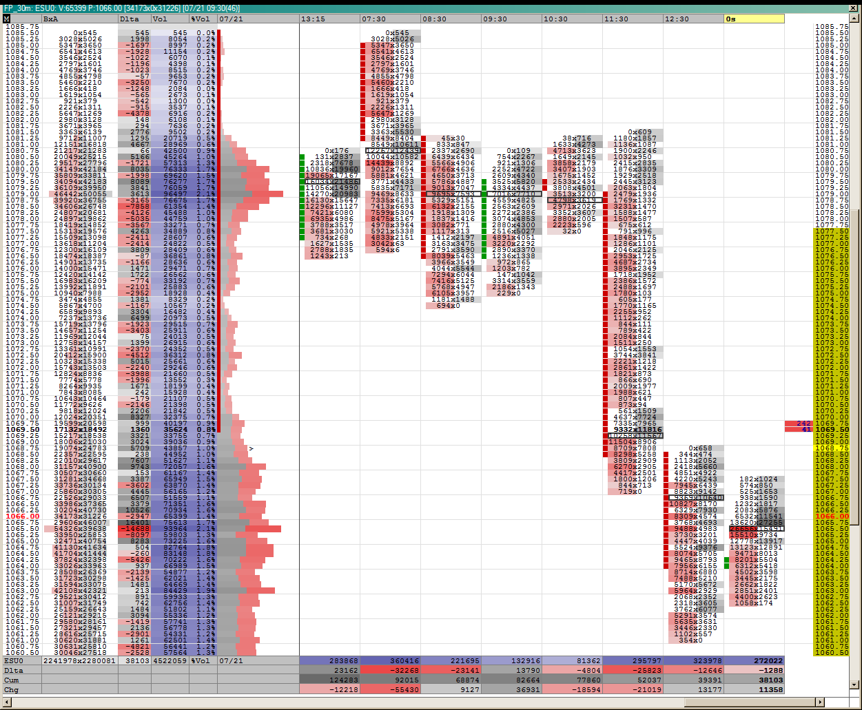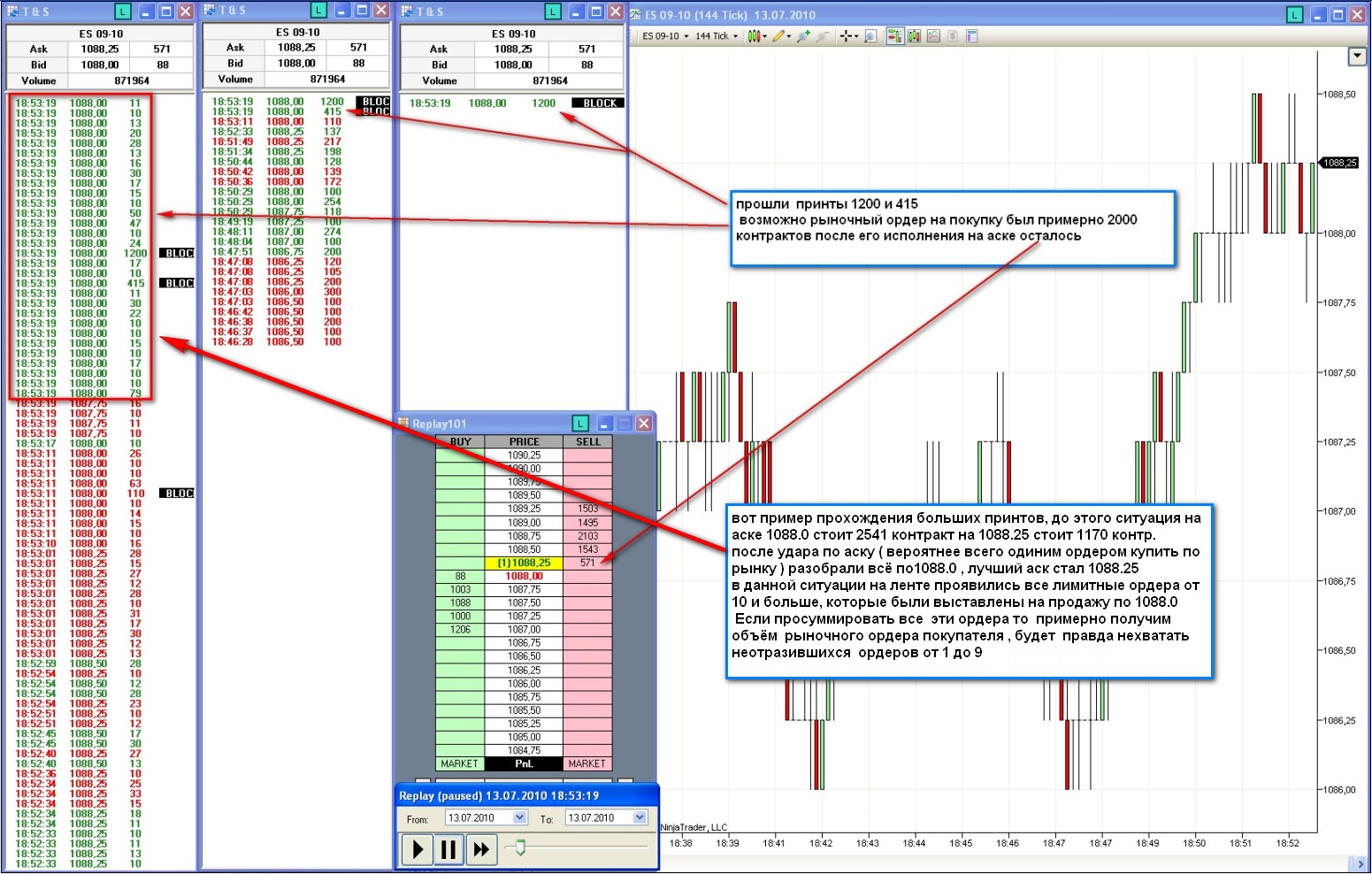 1 и 9 что не хватает это та мелочь которую ты даже не фильтруешь. Итак механизм такой. В стакане стоит ордер в 5000 по 1089,50 на продажу. По рынку по ленте проходит 2000 по аску. Зеленым горит 2000 на ленте, которые прошли по 1089,5.В стакане горит 3000 по 1089,5. Все. Я просто смотрел одну лишь ленту и теперь понятно что я не видел. СТАКАН. СТАКАН+ЛЕНТА+ГРАФИК+ОПЫТ+ЛОГИКА. ПРОСТО!!!посмотри вторая картинка ES от 13.07.10 которые я выкладывал. Я так понимаю