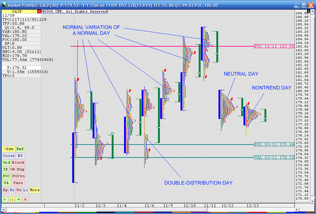 Если решетка (#) - это закрытие, то четвертый слева - double distribution trend day. А вообще приколько газик пляшет. Это именно акции, а не фьючерс?Елена, укажи на возможные ошибки при идентификации дней