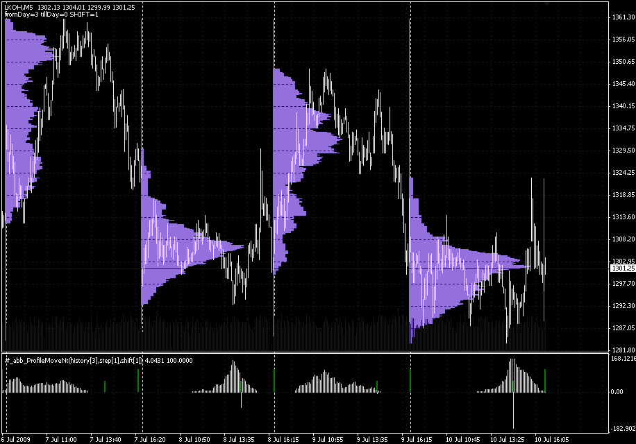 Вот прикрутил самолепное подобие профиля к нашим стокам. Есть здесь кто Лучком торгует? Ниже LKOH, M05. Буковки и расцветку мне вырисовывать лень, но так даже точнее. Гистограмки отнормированы от предыдущего дня. Но это тонкости.. Дплее думаю посчитать: VAH, POC, VAL.