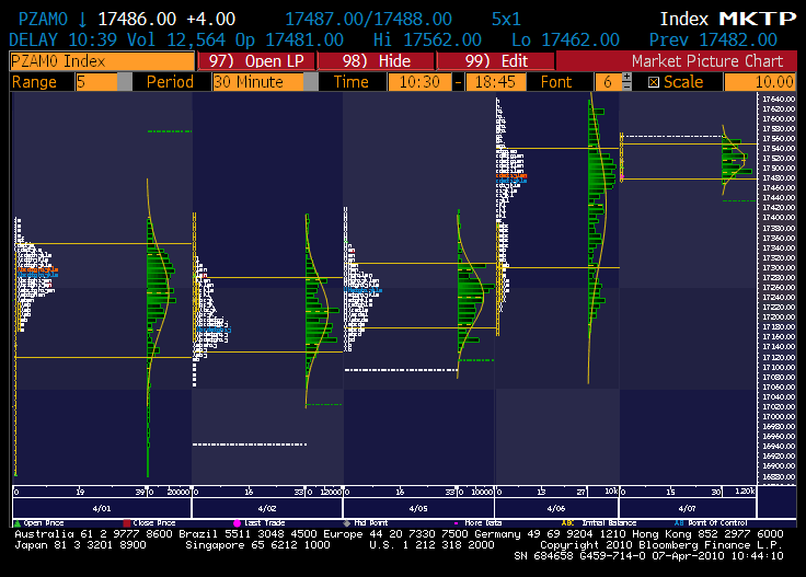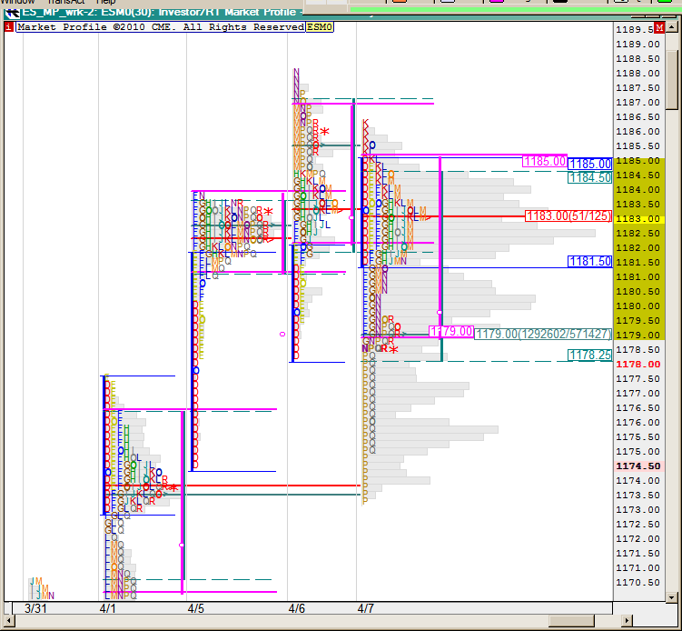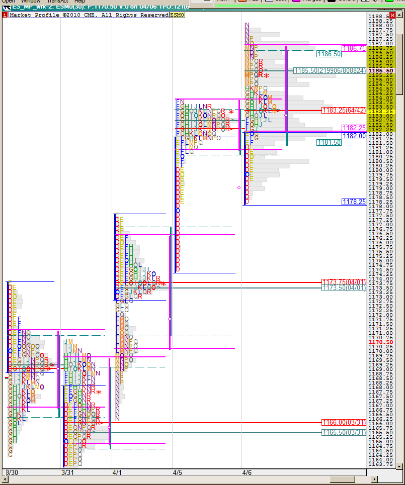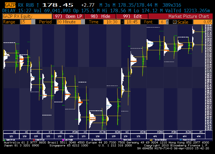 Профиль фРТС за 6 апреля. Дабл дистрибьюшен дэй, РОС = 1613 - ещё подняли - почти на уровне закрытия 1612. Возможно это говорит о равновесии сил и приемлимости текущего уровня цен. Но РОС на нижней горбинке, что опять же характеризует о слабости быков пойти выше. День грядущий покажет.