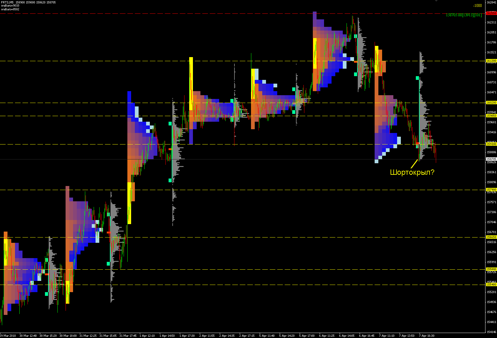 Видим, что 1 апреля был шортокрыл, затем 2-го и 5-го торговались в балансе - обживали новый уровень.