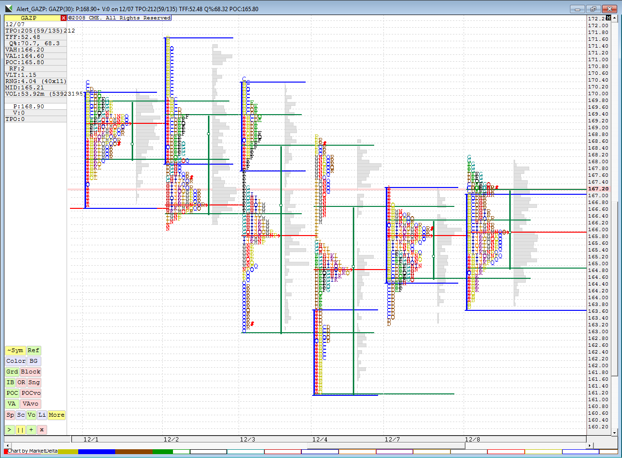 Удивительно, что 70 до сих пор не можете протестировать. Быстро должны пойти, когда с 66 распрощаетесь. Куда, вам лучше знать)Зона 167.2 как уровень сопротивления собрала в себе и VAH и верхнюю границу IB и Close. TFF в пятницу уже НЕПРИЛИЧНО высокий = 115, RF = -2. Я в лонгах спота Газпрома без плечей и шортах SRH (от 7520, маржу использовал процентов на 70, т.е. плечо где-то 1 к 4). По мани-менеджменту всё нормуль - лонги по сумме раза в 2 тяжелее фьючей. Всю неделю хеджировался шортами на М1-М5-М15, т.к. был боковик. Лонги не трогал. И хочу сказать, что самые примитивные осцилляторы дали возможность очень неплохо заработать на ФОРТСе. Если разовьем тренд, то главное будет - не выйти на первой остановке, и сменить осцилляторы на трендовые индикаторы, а также смена рабочих таймфреймов с M1-M5-М15 на M15-H1-H2. Перестроиться всегда сложно, и даже для организма новые условия - это стресс))) Однако, я всегда задаюсь вопросом - если бы люди во времена Александра Великого и 2-й мировой войны думали о стрессах и депрессиях, то жили бы месяцами в одном и том же окопе) Оторвало коллеге по оружию голову - всё, пипец, сегодня я не воин) Так что стягиваем силы и готовимся к битве при Гавгамэллах) Сопли в сторону)