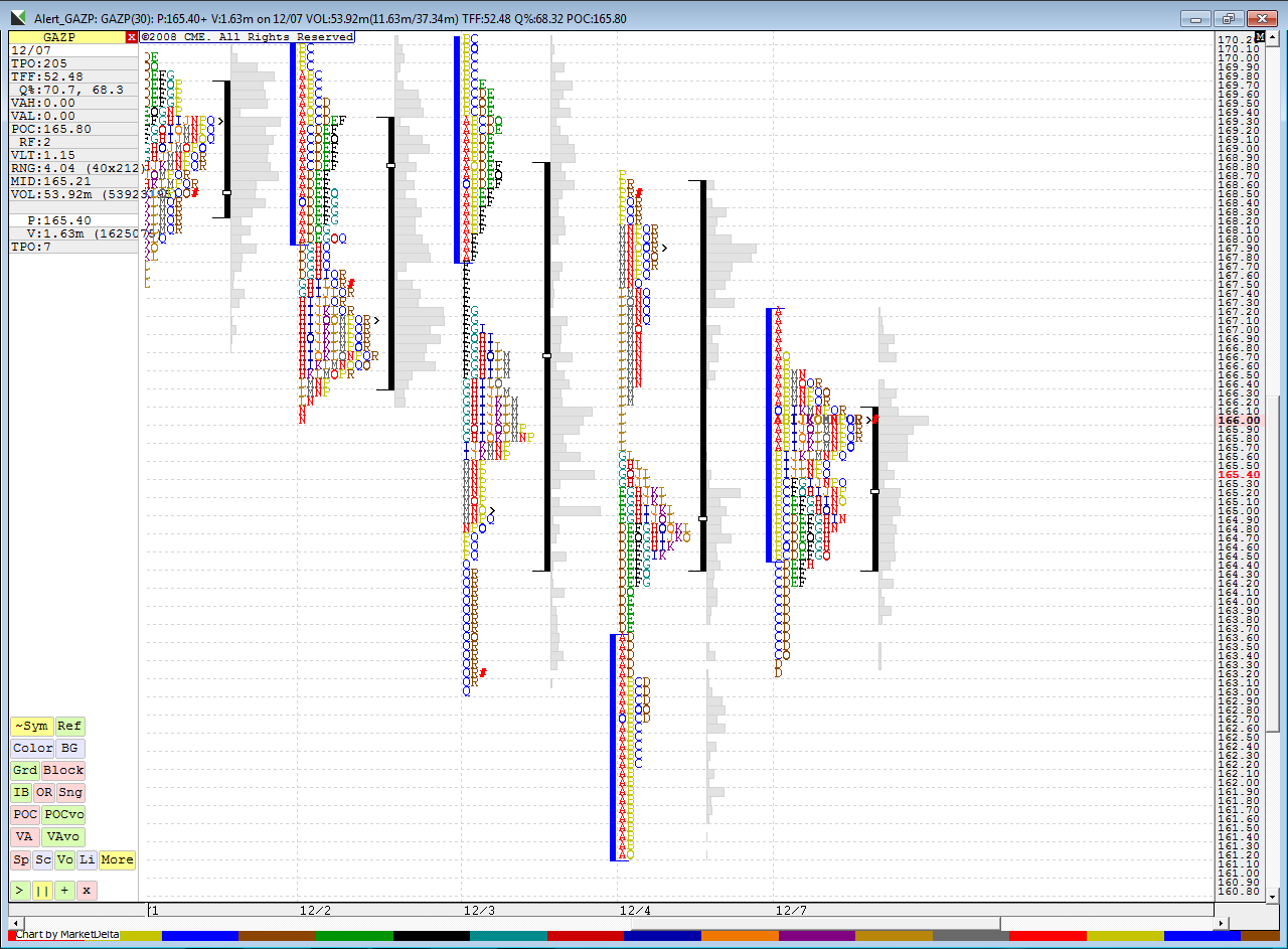 Был buying tail, правда, не в виде single print, однако то расширение, которое произошло в периоды C и D, впоследствии было отвергнуто. Подозреваю, что просто провалились в районе 12:00, а потом отросли обратно. Кроме того, с периода I уровень контроля подняли на рубль выше. Закрылись в начальном диапазоне. Selling tail намного менее впечатляет, чем buying tail. TPO Count по итогам дня говорит о преимуществе покупателей.Как раз в плане directional conviction его назвать нейтральным нельзя, все таки преобладали большие продавцы: расширили диапазон вниз, не пробили диапазон вверх, оставили selling хвост, оставили полки вверху, хвоста внизу нет...