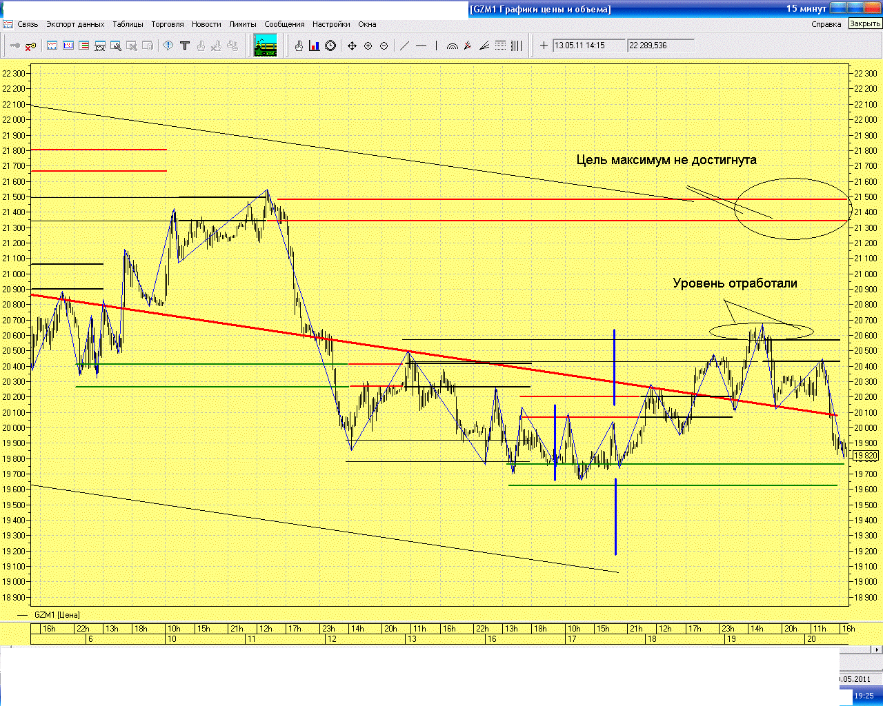 Это есть работа на упреждение.Большой риск,ИМХО..Всё же лучше дождаться хотя бы каких нибудь сигналов НАЧАЛА отскока.Они есть у Вас?Ну кроме подхода к границе канала,разумеется..Этого недостаточно,как мне кажется..Я кажется скидывал уже это график. Синие вертикальные отрезки - это уровень фиксации. Ну как всегда, пробой канала на величину канала. Верхний уровень отработал, нижний уровень сейсас показали 19200. Конечно, уровень фиксации не показатель разворота, но отскоки же должны быть?!