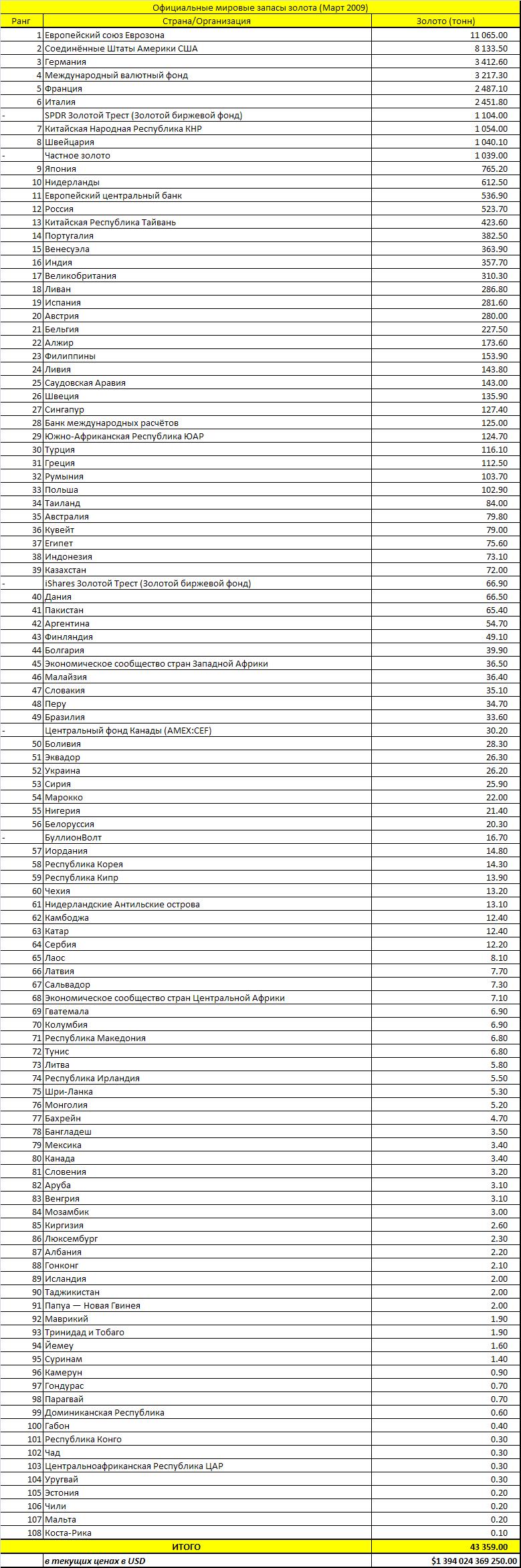 Для начала приведу статистику золотых запасов (См. таблицу)