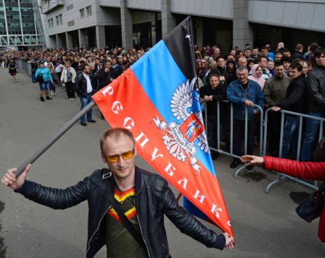 Очередь, как сообщается, начинается от дома №21 и идет до площади Киевского вокзала. Собравшиеся принесли флаги самопропозглашенной Донецкой народной республики (ДНР).